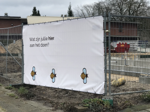 - De bouwplaats aangekleed met bouwhekdoeken met kinderteksten