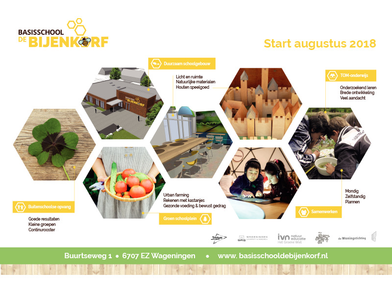 Het is dan ook niet zomaar een school. De Bijenkorf wordt de meest duurzame school van Wageningen. Dichtbij het centrum, kleinschalig van opzet. En met een groen plein. Ook het onderwijsconcept is vooruitstrevend te noemen. Spelenderwijs ontdekken de kinderen hoe alles groeit en bloeit en bedenken ze samen kleine oplossingen voor grote problemen. Een brede ontwikkeling die verder gaat dan meetbare leeropbrengsten. Echt een Wageningse school. En weer een zeer populaire school. Missie geslaagd.[/vc_column_text][/vc_column][/vc_row]